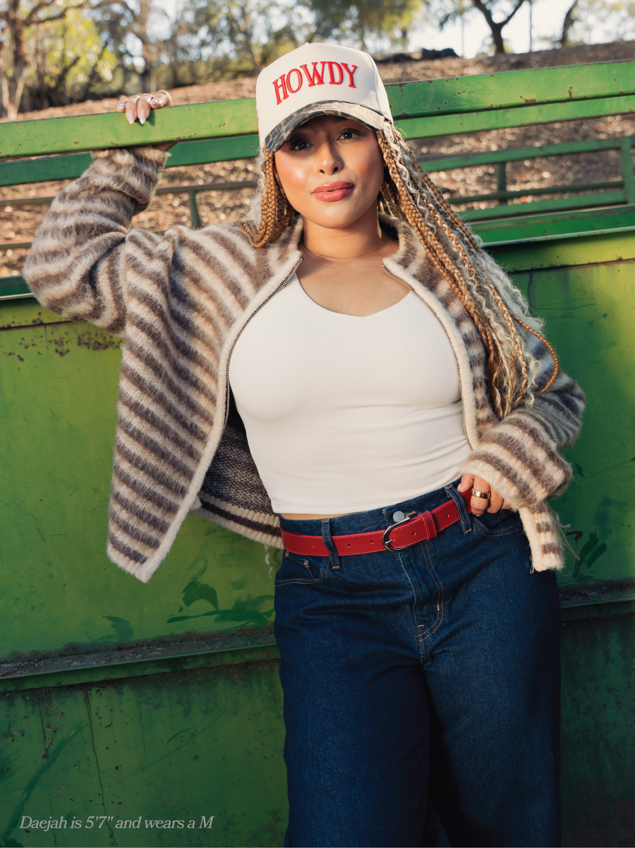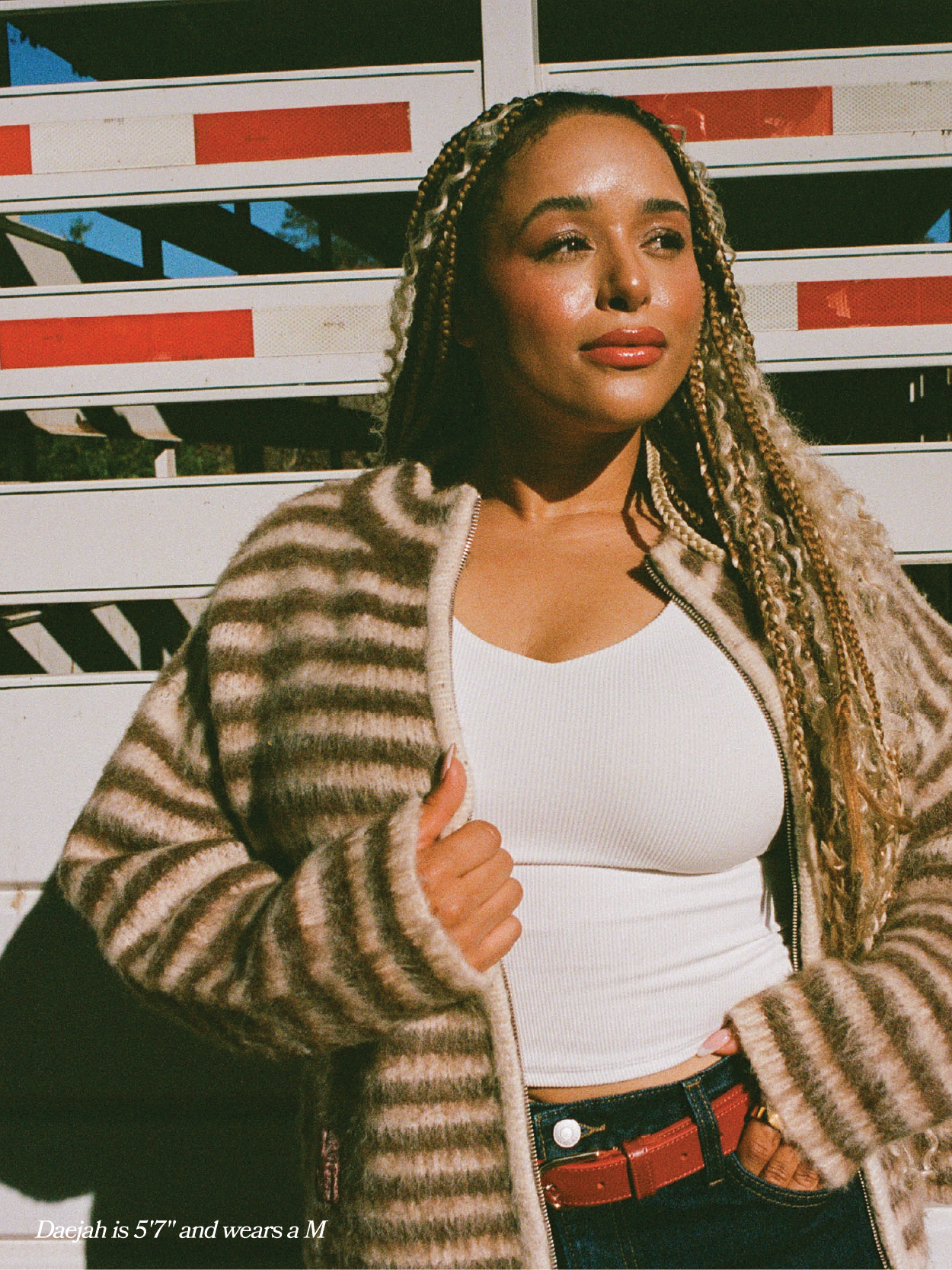 Wool-blend striped sweater with a sleek mock neck and subtle zipper. Warm, soft, and versatile — wear it open for a light layer or zipped for added warmth.